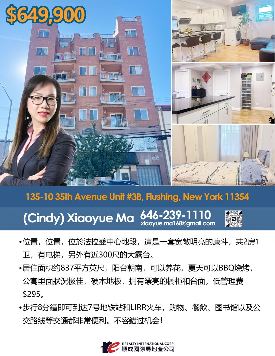 位置。新上市位於法拉盛中心地段,地址135-10 35Ave #3B Flushing,這是一套宽敞明亮的康斗,共2房1卫,有洗烘机,有电梯,另外有一個近300尺的大露台。