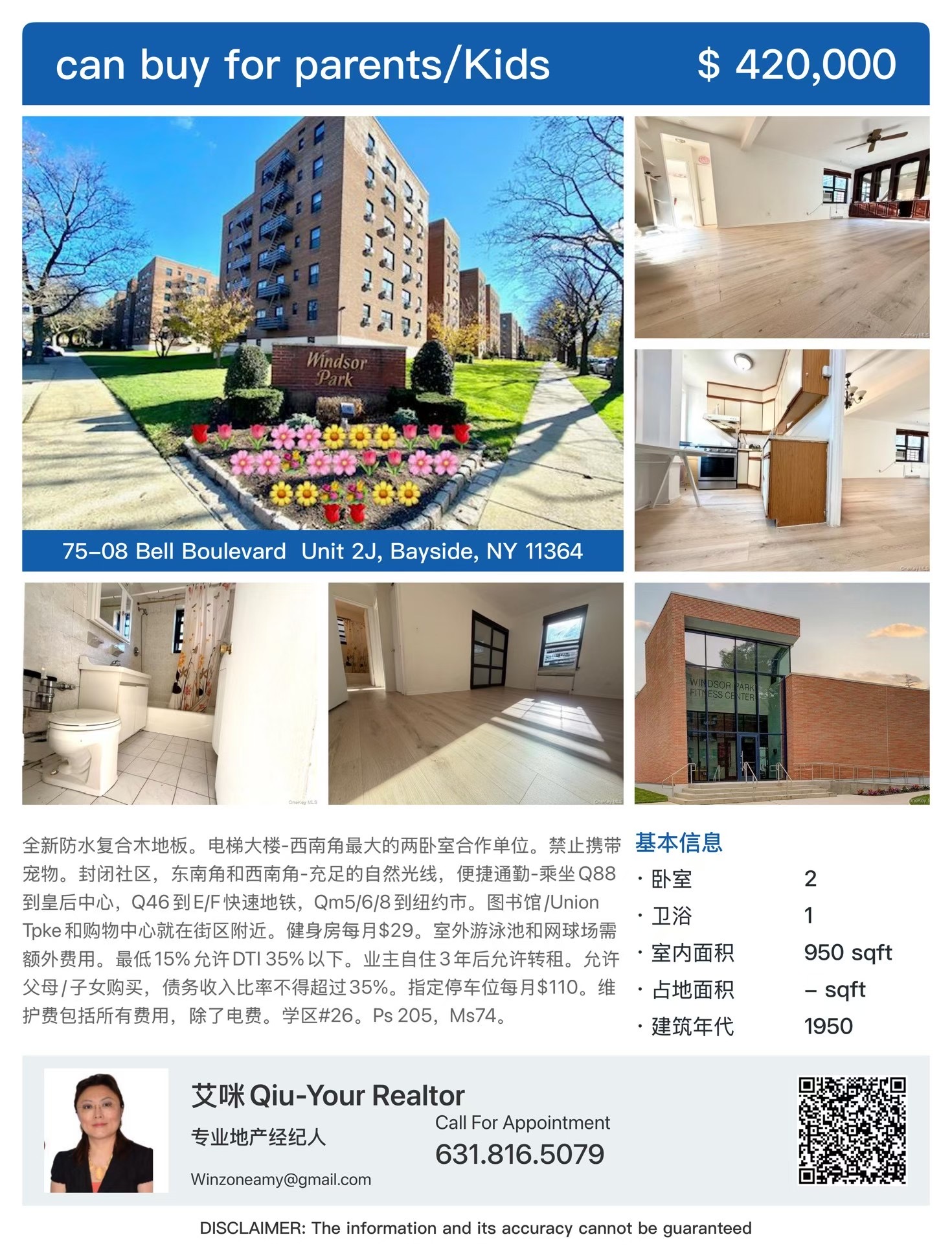 全新防水复合木地板。电梯大楼-西南角最大的两卧室合作单位。禁止携带 基本信息宠物。封闭社区,东南角和西南角-充足的自然光线,便捷通勤-乘坐Q88到皇后中心,Q46到E/F快速地铁,Qm5/6/8到纽约市。图书馆/UnionTpke 和购物中心就在街区附近。健身房每月$29。室外游泳池和网球场需额外费用。最低15%允许DTI 35%以下。业主自住3年后允许转租。允许父母/子女购买,债务收入比率不得超过35%。指定停车位每月$110。维•占地面积护费包括所有费用,除了电费。学区#26。Ps 205,Ms74。