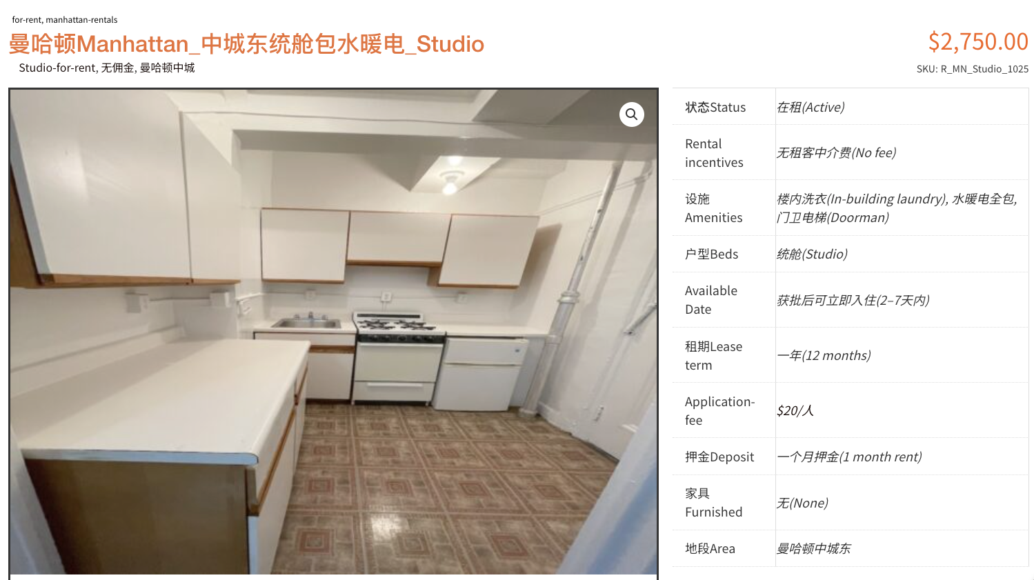 3️⃣ 曼哈顿 Manhattan – 中城东统舱:$2750/月(水暖电全包)