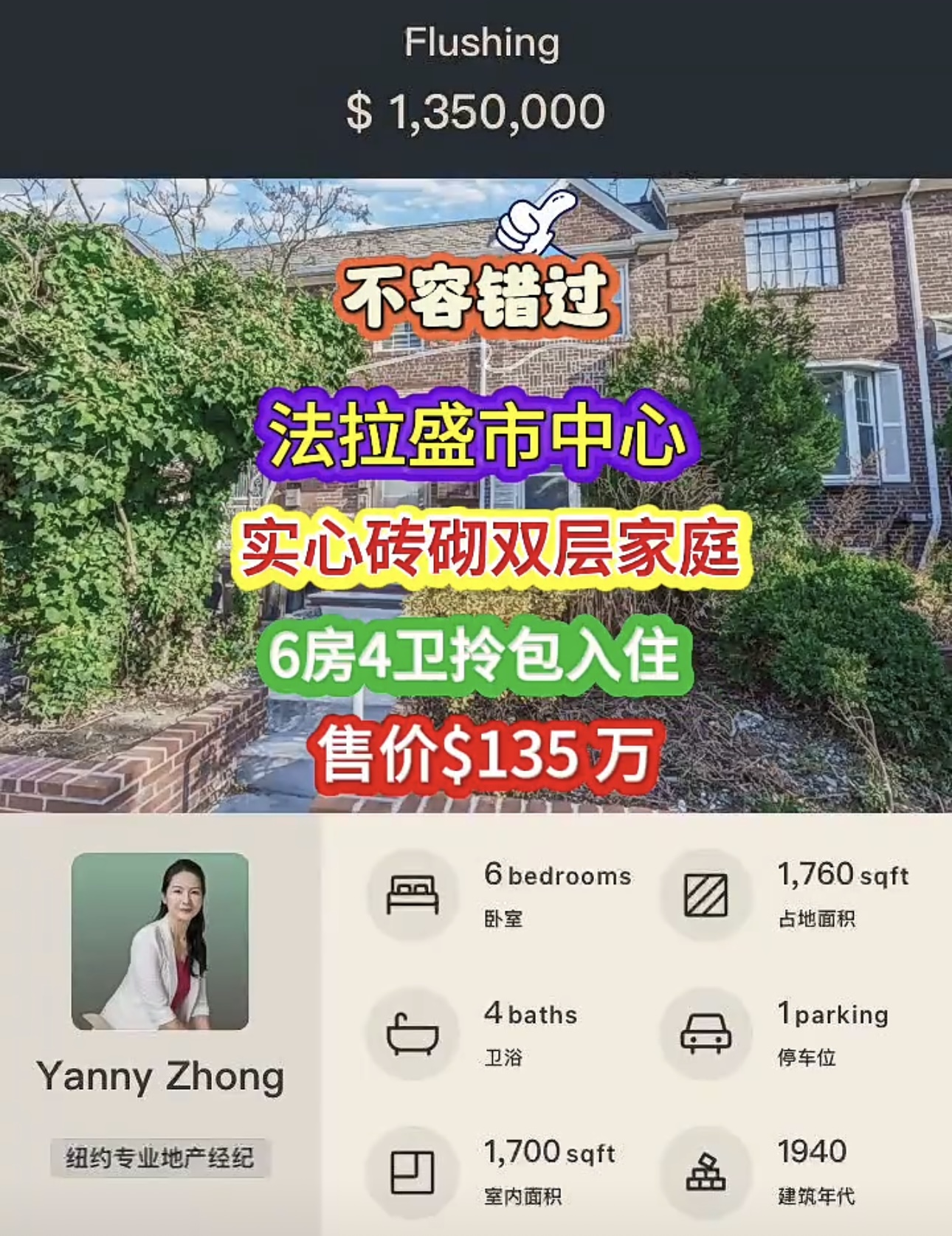 🌹法拉盛市中心的一栋实心砖砌的双层家庭收入房产。