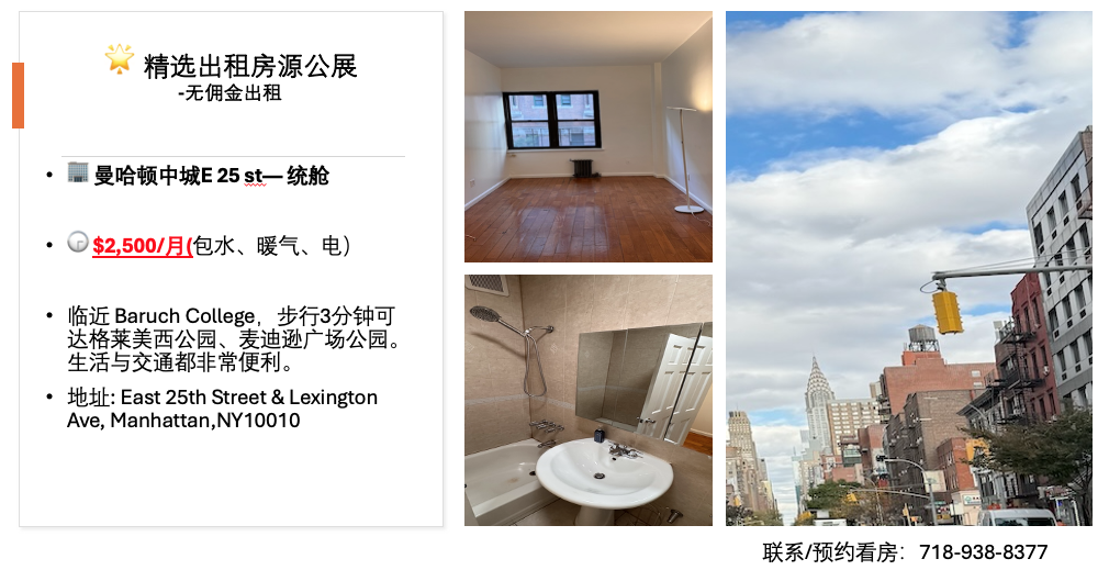 纽约曼哈顿中城整套 Studio 统舱出租 — $2,500/月(包水、暖气、电)