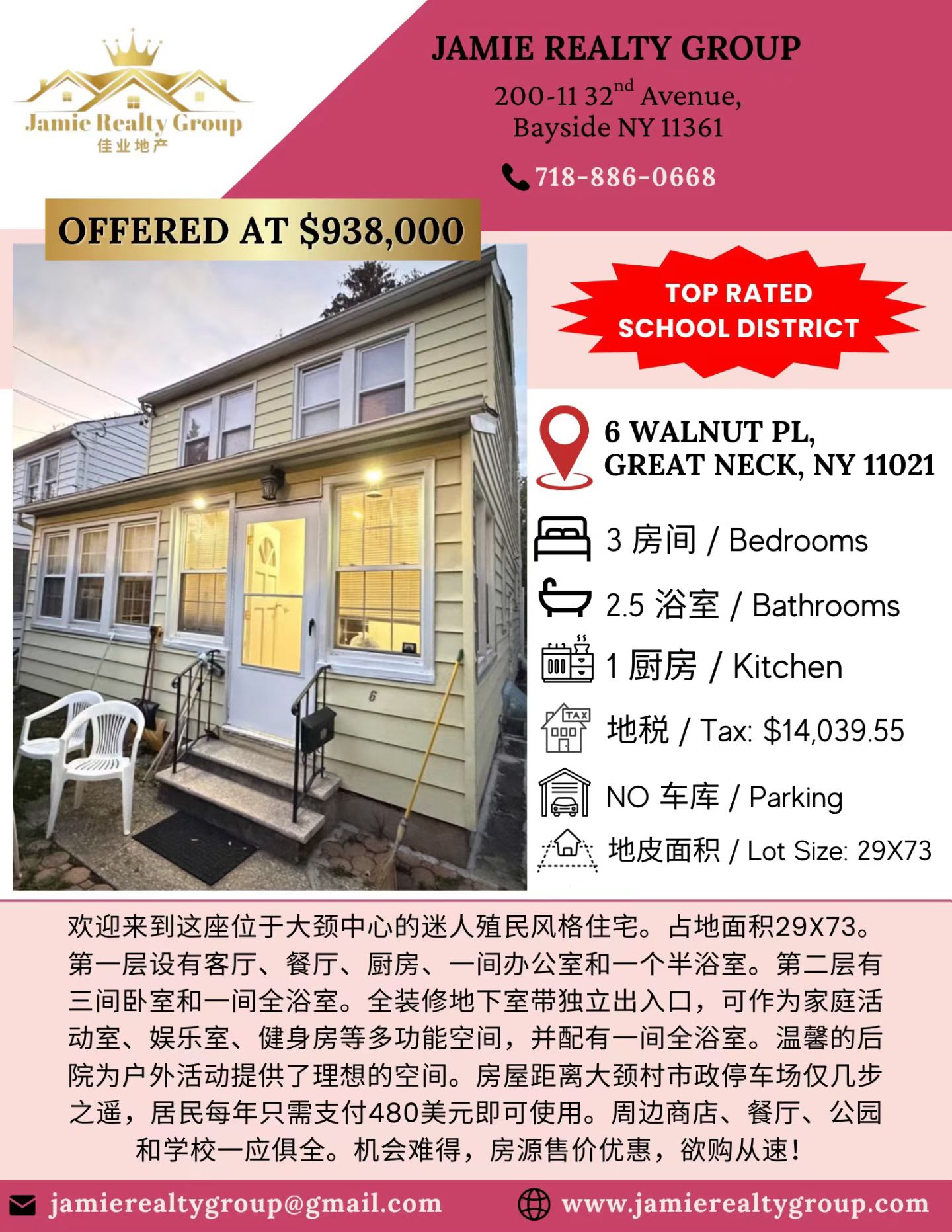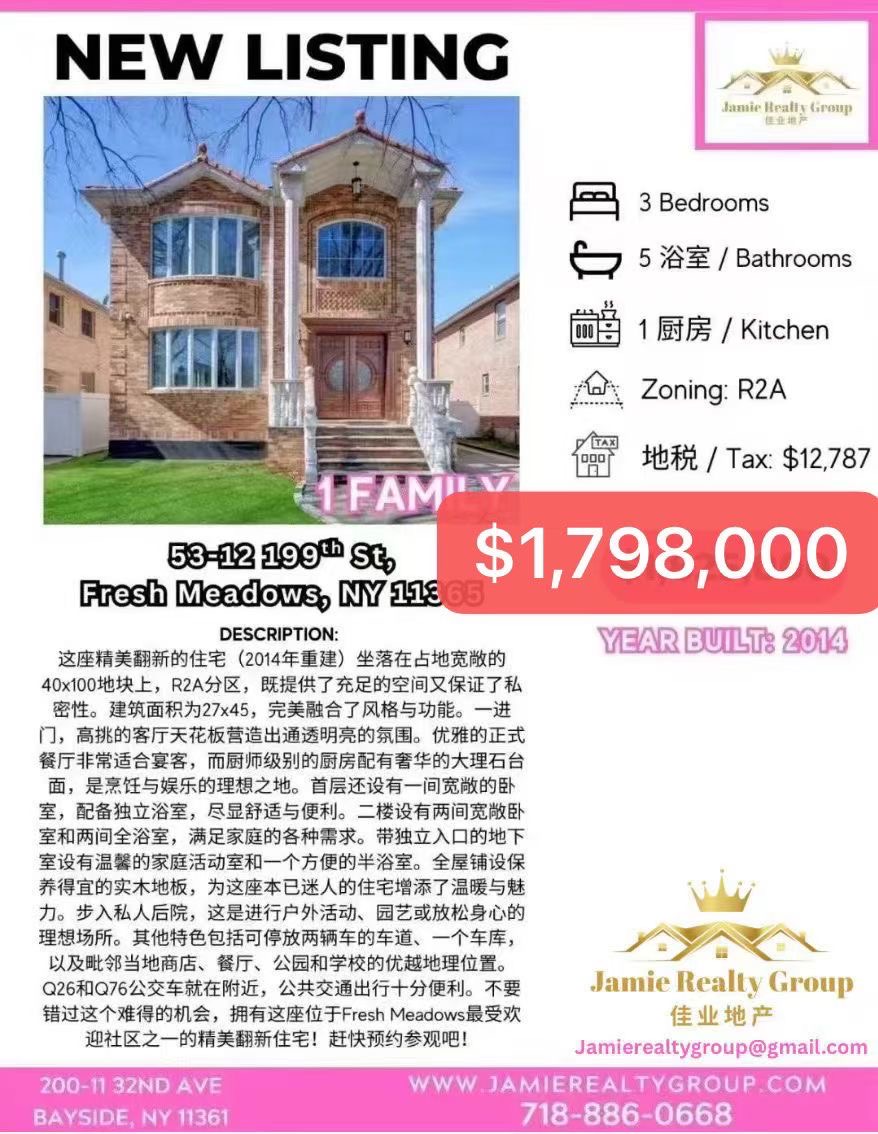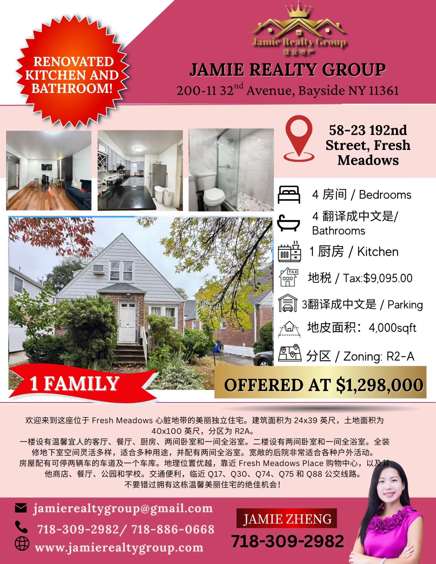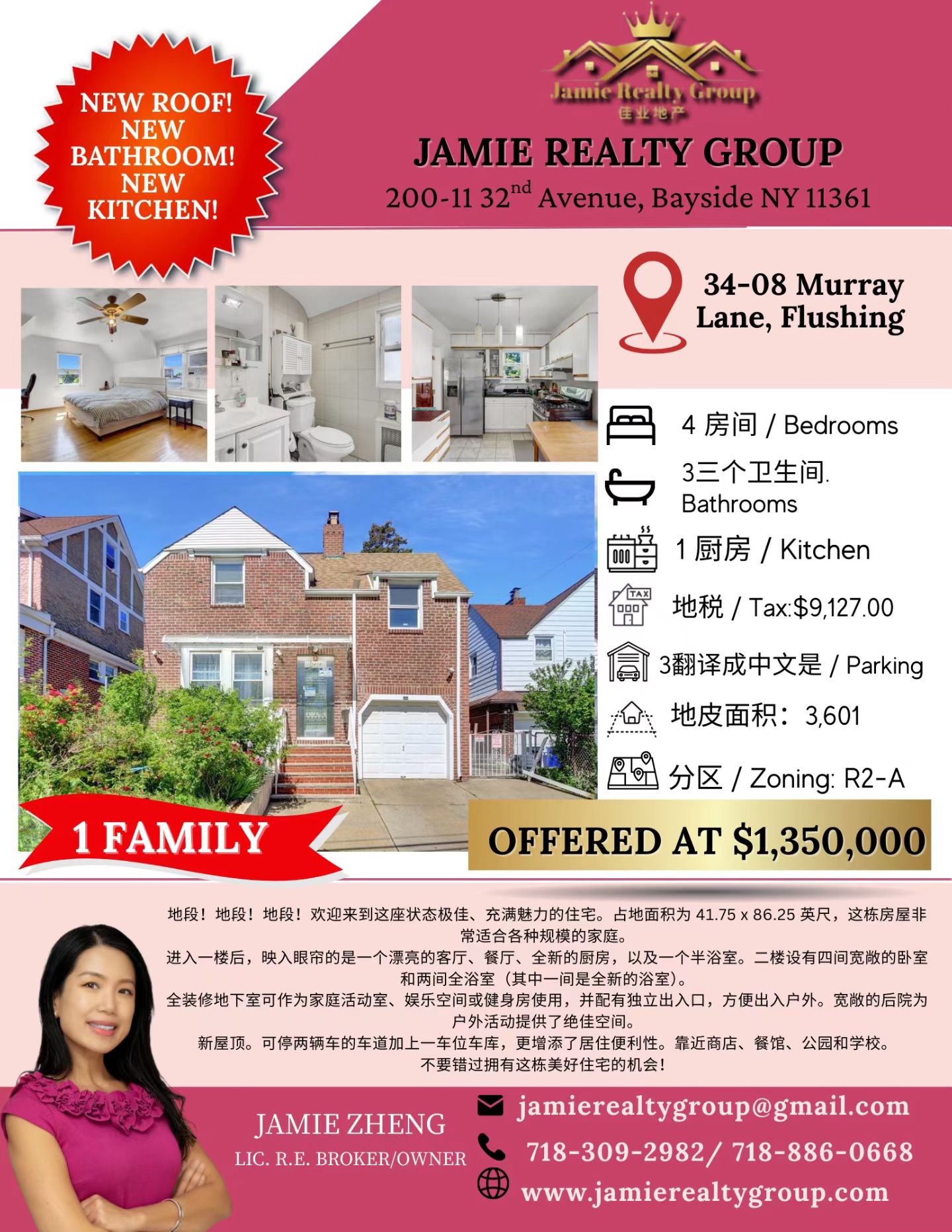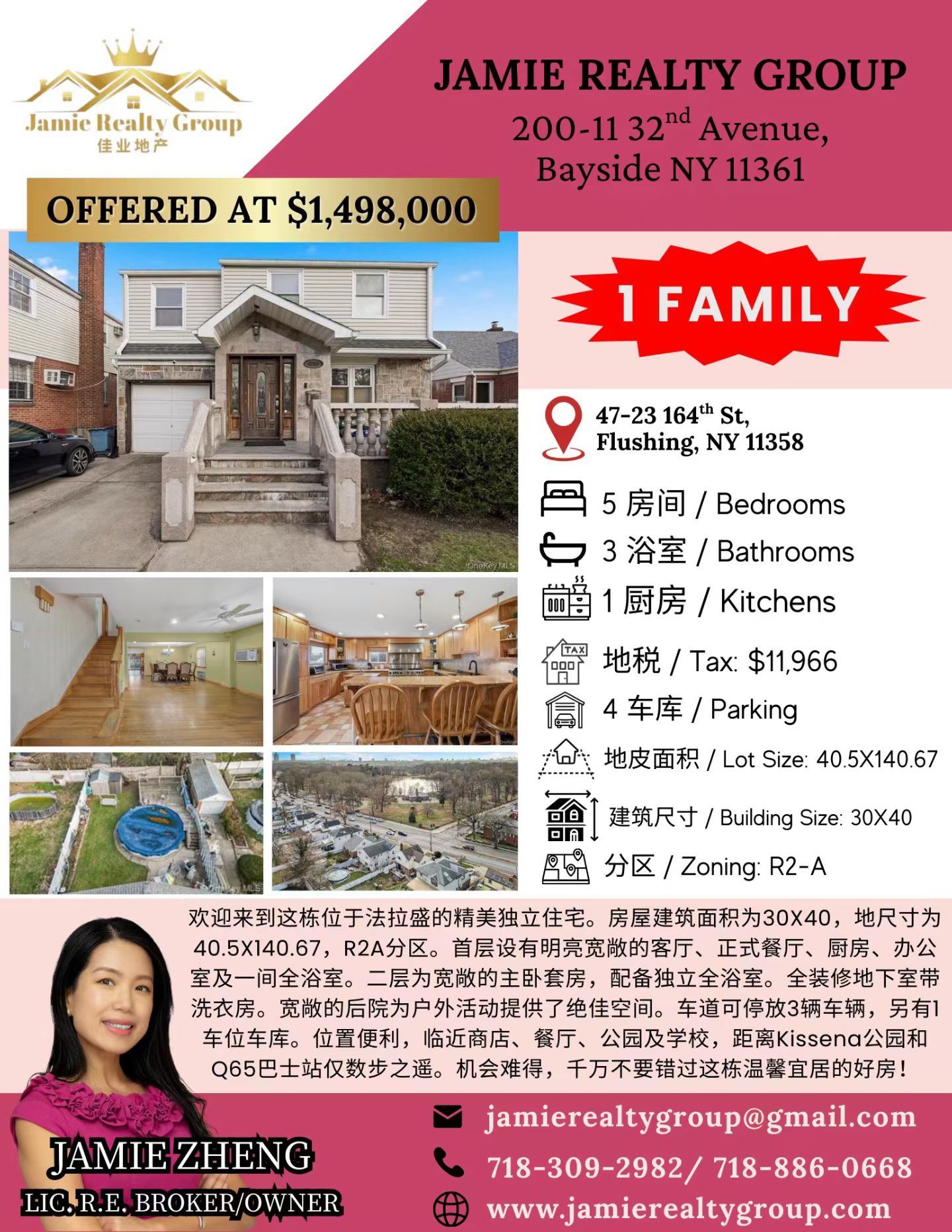 欢迎来到这栋位于法拉盛的精美独立住宅。房屋建筑面积为30X40,地尺寸为40.5X140.67,R2A分区。首层设有明亮宽敞的客厅、正式餐厅、厨房、办公室及一间全浴室。二层为宽敞的主卧套房,配备独立全浴室。全装修地下室带洗衣房。宽敞的后院为户外活动提供了绝佳空间。车道可停放3辆车辆,另有1车位车库。位置便利,临近商店、餐厅、公园及学校,距离Kissena公园和Q65巴士站仅数步之遥。机会难得,千万不要错过这栋温馨宜居的好房