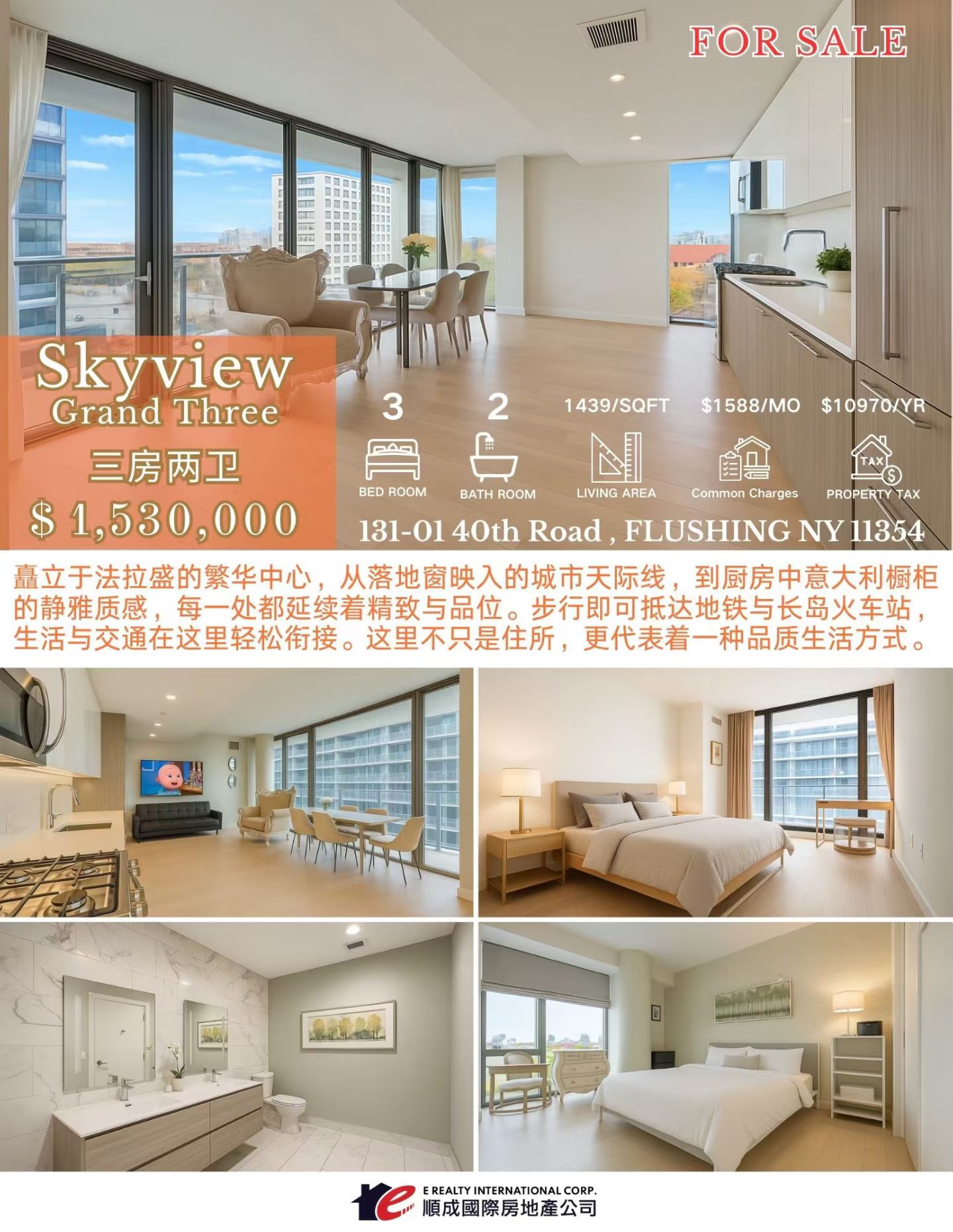 法拉盛康斗出售SkyView Grand Three 豪华三房两卫 Condo 出售