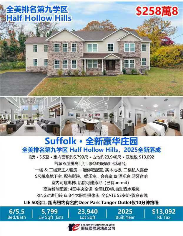 ✨ Half Hollow Hills全美排名第九长岛学区 · Suffolk · 全新豪华庄园 ✨