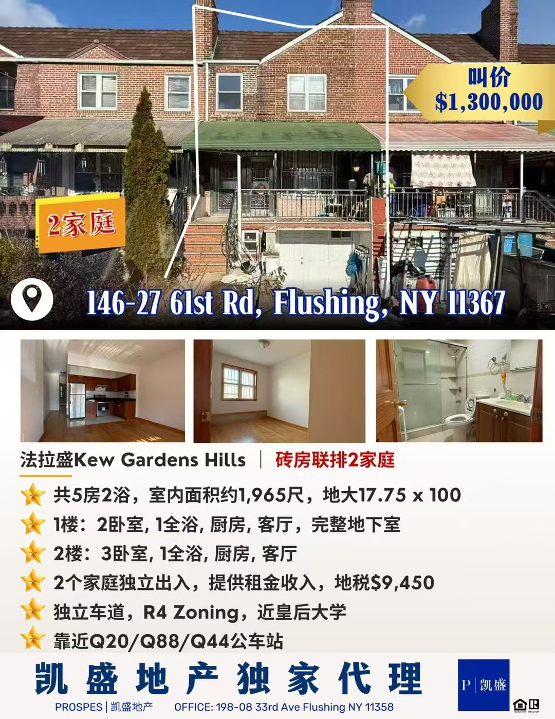 法拉盛 Kew Gardens Hills 砖房联排2家庭 🔥