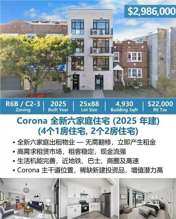 这是目前皇后区 极为稀缺的全新建六家庭出租物业,地段成熟、分区优越、现金流潜力清晰,非常适合追求稳健回报 + 长期增值的投资型买家。
