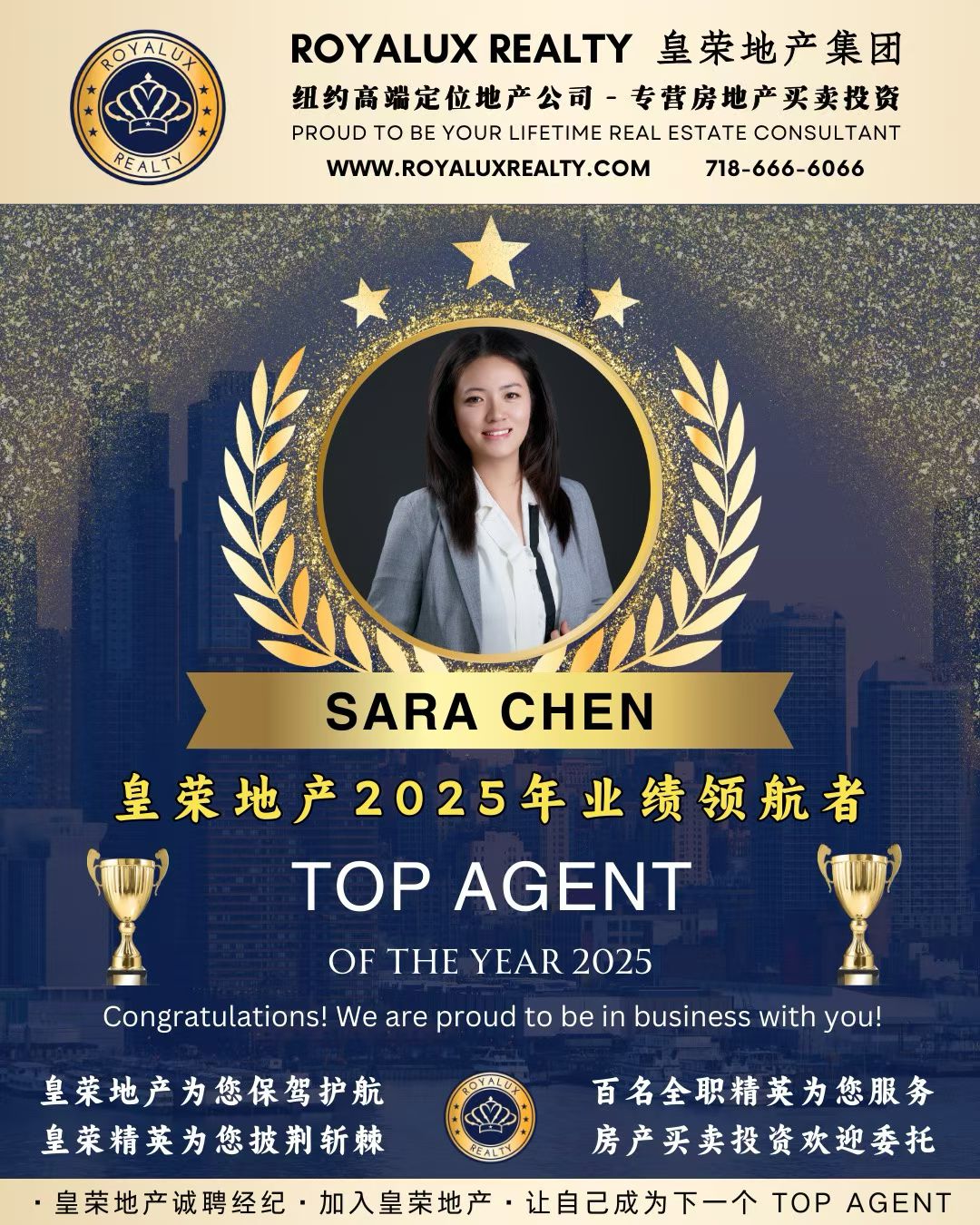 🏆 很荣幸再次登上【皇荣地产2025年度销售精英榜】!衷心感谢每一位新老客户的信任与托付,也为我们公司再创新纪录而感到骄傲——2025年,皇荣团队总成交额突破3.93亿美元,成功帮助482个家庭在纽约安家落户,实现了他们的置业梦想。