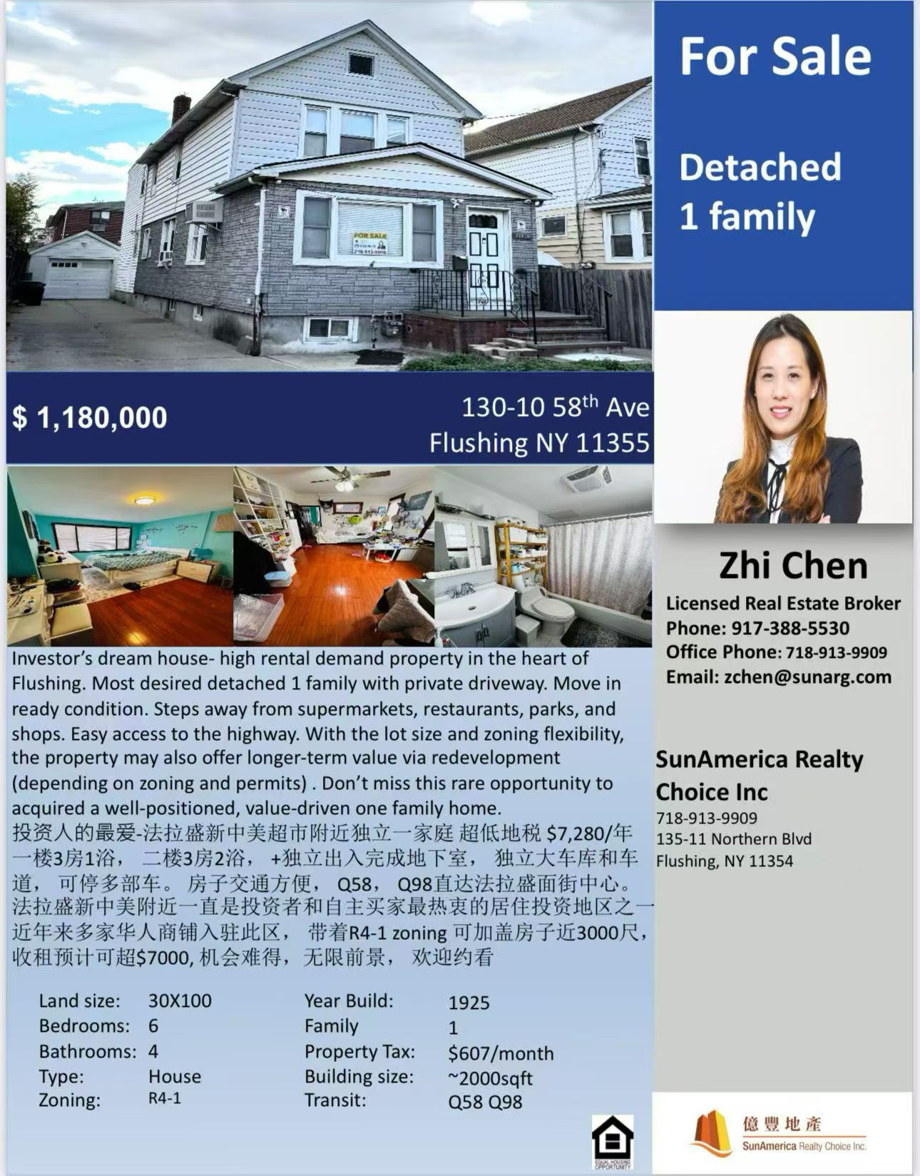 住宅地税仅 $7,280/年,性价比高,长期居住或出租投资均十分理想。物业 Zoning R4-1,可扩建地面三层两家庭,每层约1000平方尺,为未来改造或增加投资回报提供潜力。
