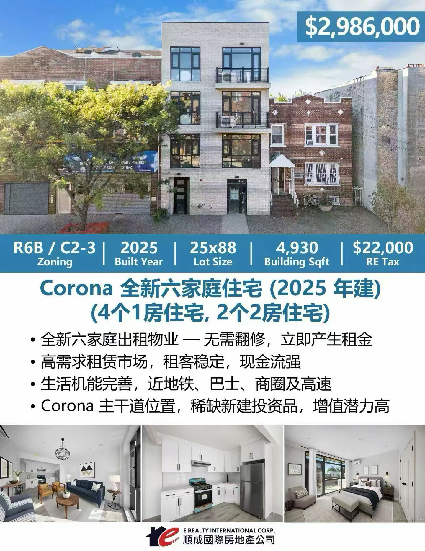 皇后区Corona核心地段的全新六家庭投资物业现已上市,建于2025年,零翻修、拎包即可出租,兼具高租赁需求和稳定现金流,是投资者不可错过的优质机会。地址:Corona Ave, Queens, NY,售价 $2,986,000。