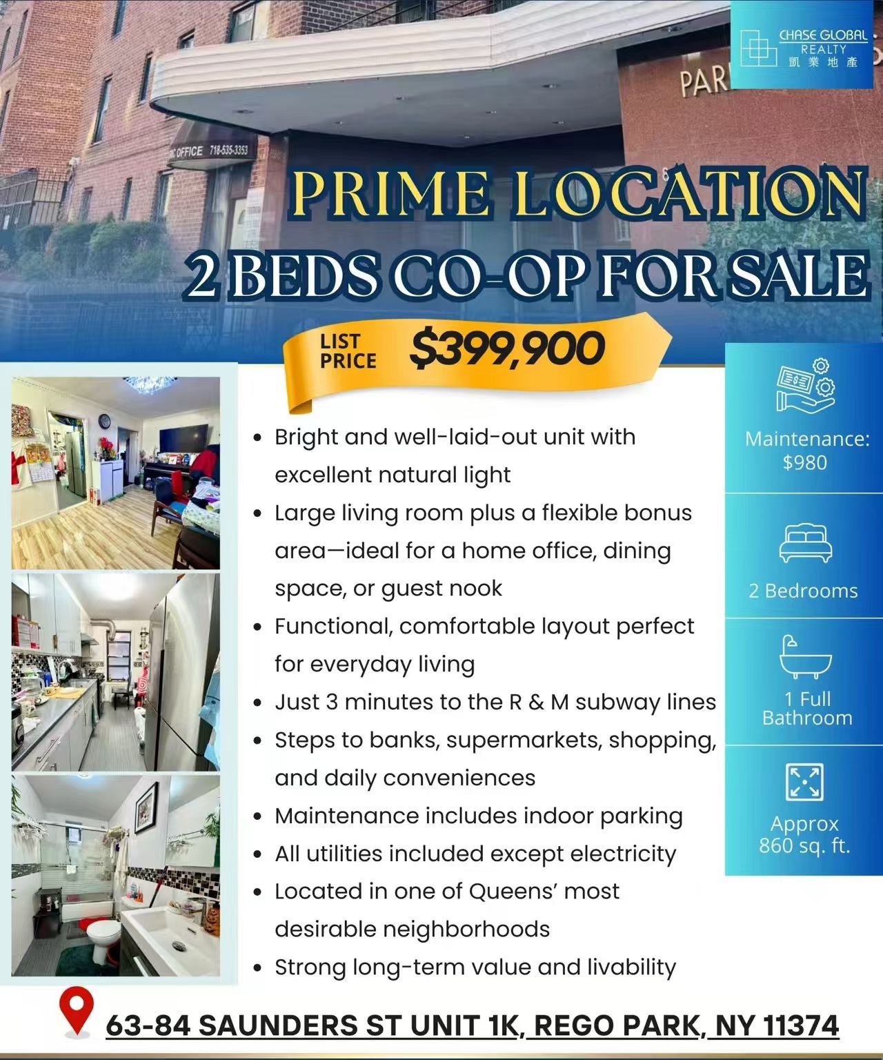 凯业地产最新上市!位于 Rego Park 核心社区 的两房一卫 Co-op,实用面积约 860 sqft,户型方正,采光充足,居住舒适,是 自住或投资的理想选择。