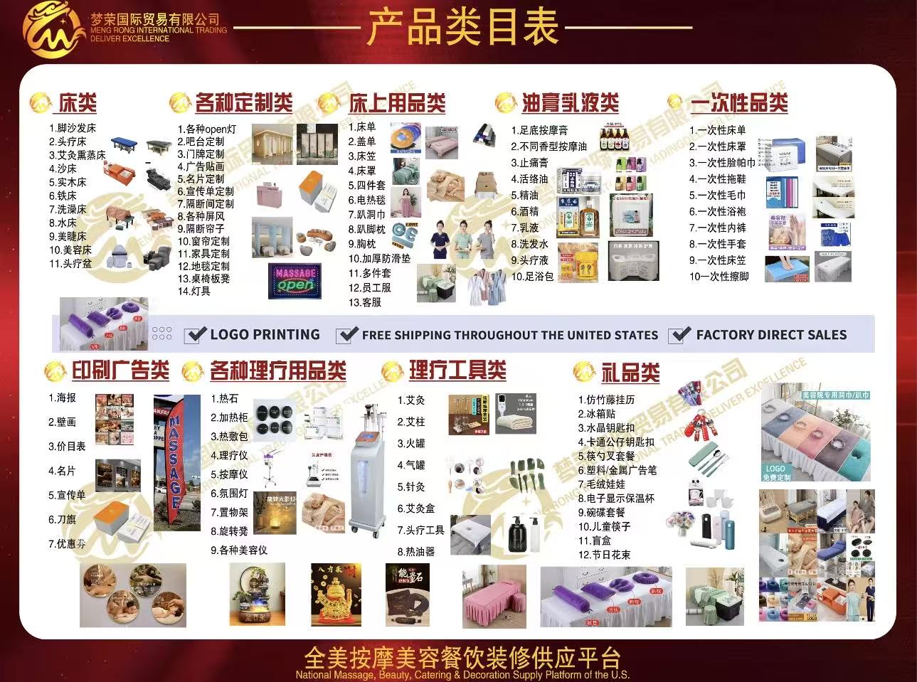 例如:床单,床罩,按摩油,各种定制类招牌灯,贴画,美容仪器 床纸 毛巾等等