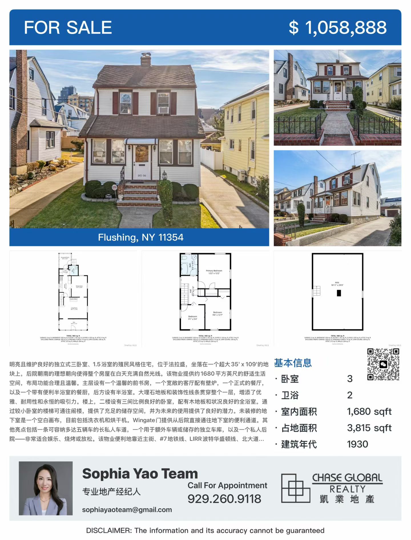 这套法拉盛稀缺独栋住宅售价 $105.8 万,适合追求生活便利或投资回报的买家。欢迎安排看房或咨询更多信息,请联系 929-260-9118,随时欢迎来电!
