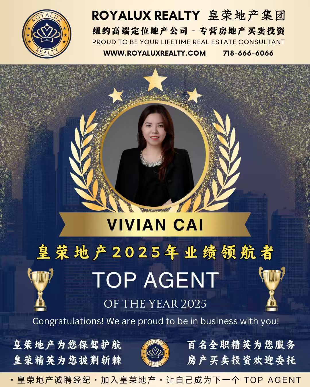 🏆 很荣幸再次登上【皇荣地产2025年度销售精英榜】!衷心感谢每一位新老客户的信任与托付,也为我们公司再创新纪录而感到骄傲——2025年,皇荣团队总成交额突破3.93亿美元,成功帮助482个家庭在纽约安家落户,实现了他们的置业梦想。