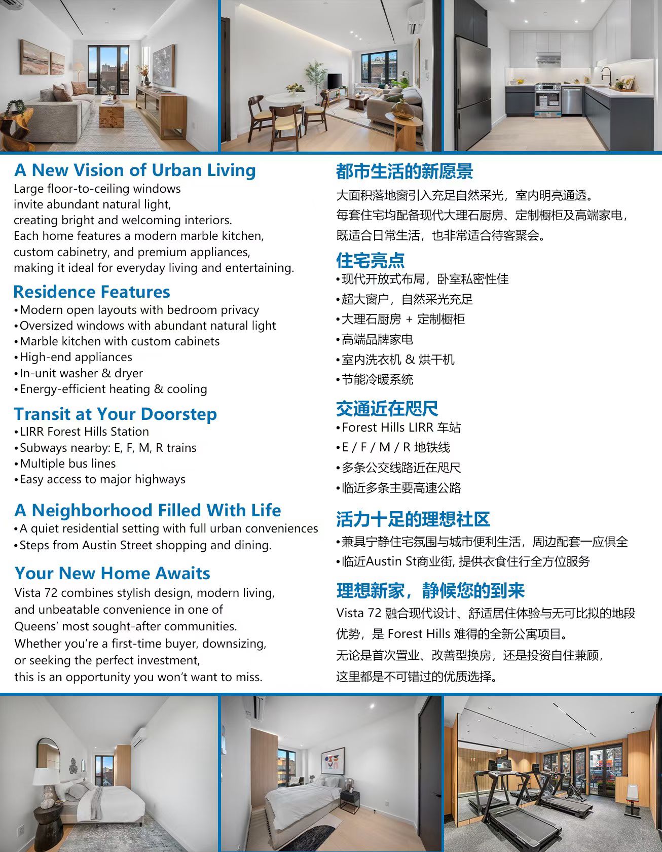 Vista 72 不只是一个居住空间,更是一种平衡生活方式的选择。无论是首次置业、升级换房,还是希望兼顾自住与投资回报,这个全新公寓项目都具备长期价值与高度流通性,是 Forest Hills 市场中不可多得的优质房源。6466669060