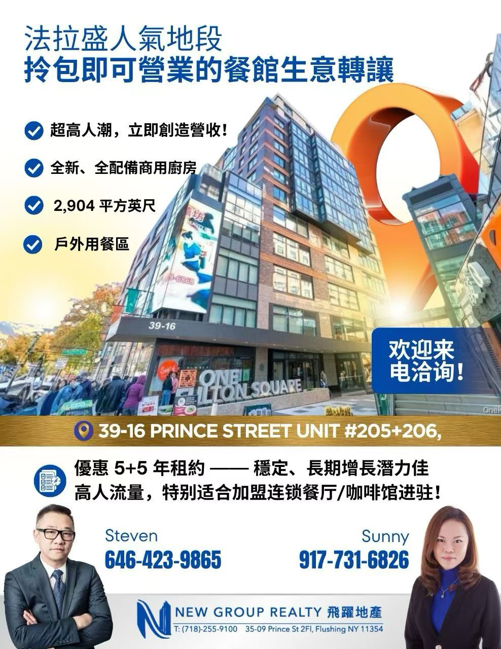 法拉盛王子街繁华中心地段,商圈人流量极高,交通便利,周边餐饮、购物、办公和社区设施完善。黄金地段铺面稀缺,适合独立餐馆、连锁品牌或知名餐饮加盟进驻,接手即可立即盈利,市场机会难得。