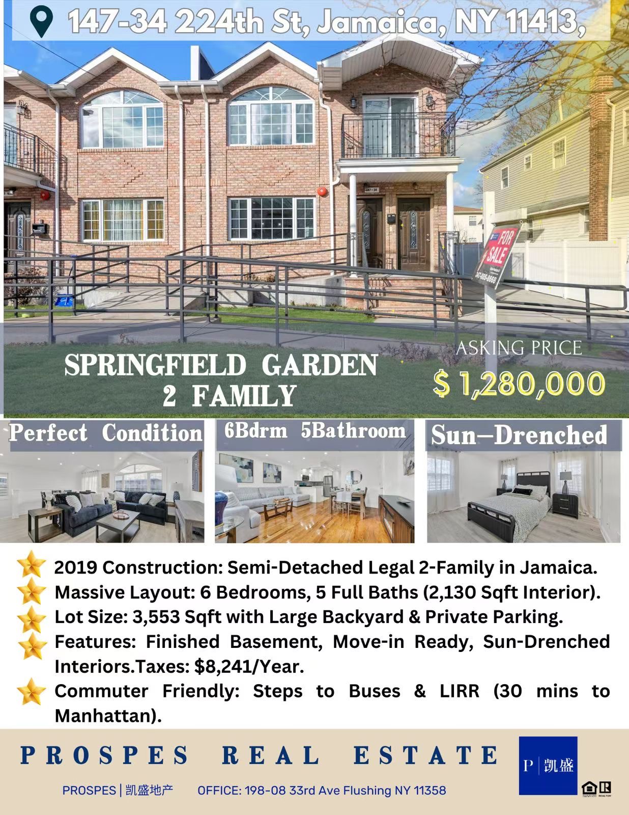 凯盛地产独家代理,全新上市!位于皇后区 Springfield Gardens 的阳光巨无霸两家庭独栋住宅,室内面积达 2,130平方尺,四面采光,挑高天花板与全屋大窗户设计让每个房间都充满自然光线,通透大气,是家庭自住或投资的绝佳选择。