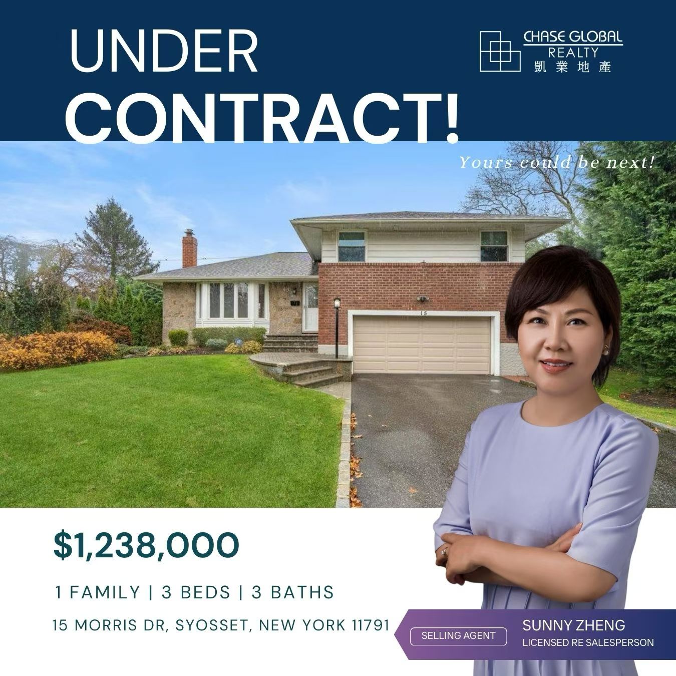 恭喜 凯业地产经纪 Sunny Zheng!在激烈竞争的市场中,凭借专业判断和高效执行力,成功帮客户锁定心仪房源——Syosset 独栋一家庭住宅,顺利进入合约阶段。