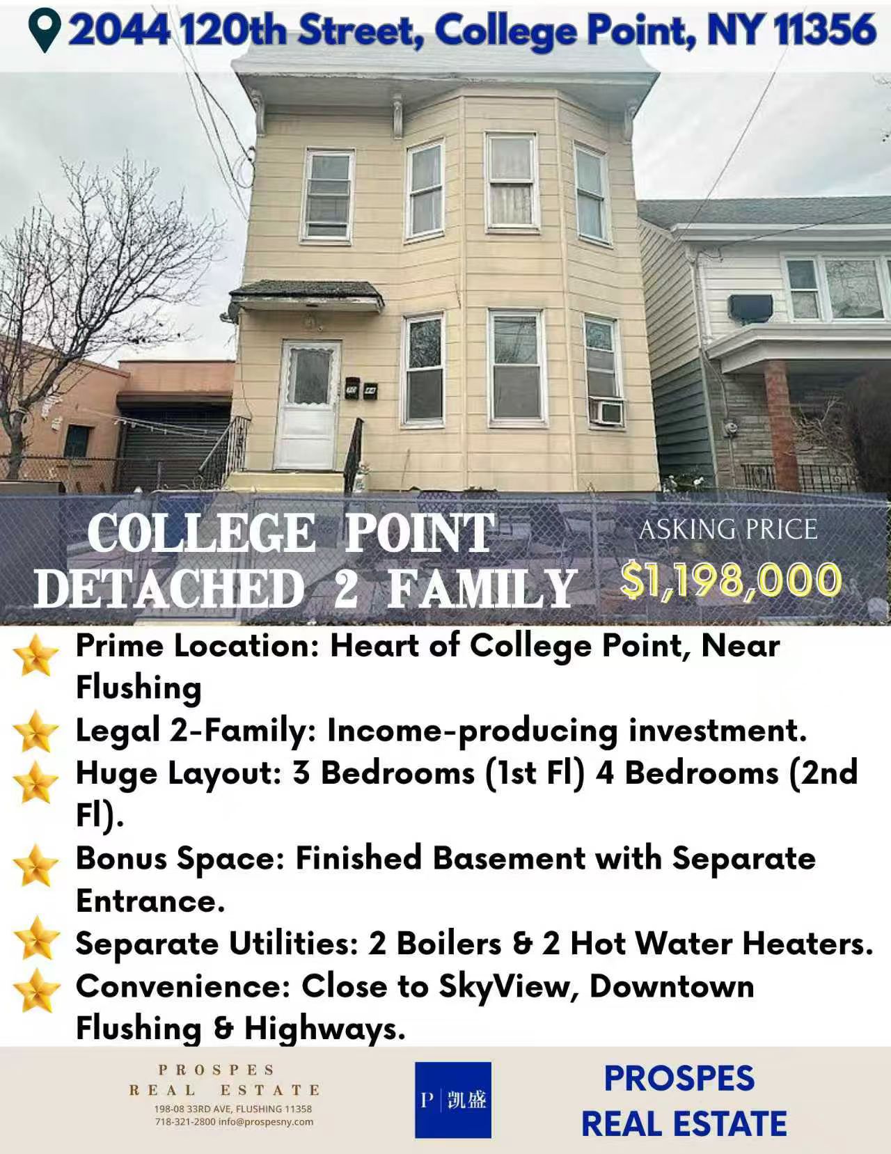 College Point 核心区合法两家庭住宅,格局合理、设施完善、投资回报高,地下室增值潜力大,是自住或投资收租的理想选择。机不可失,立即行动!