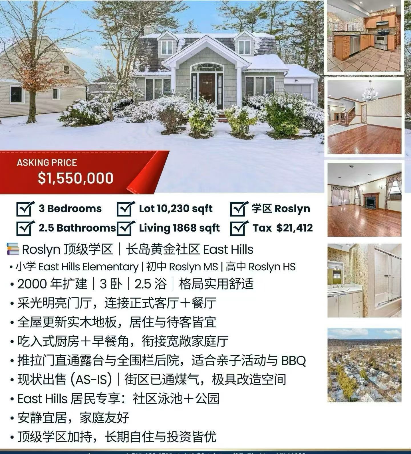 • 顶级学区:小学 East Hills Elementary、初中 Roslyn MS、高中 Roslyn HS