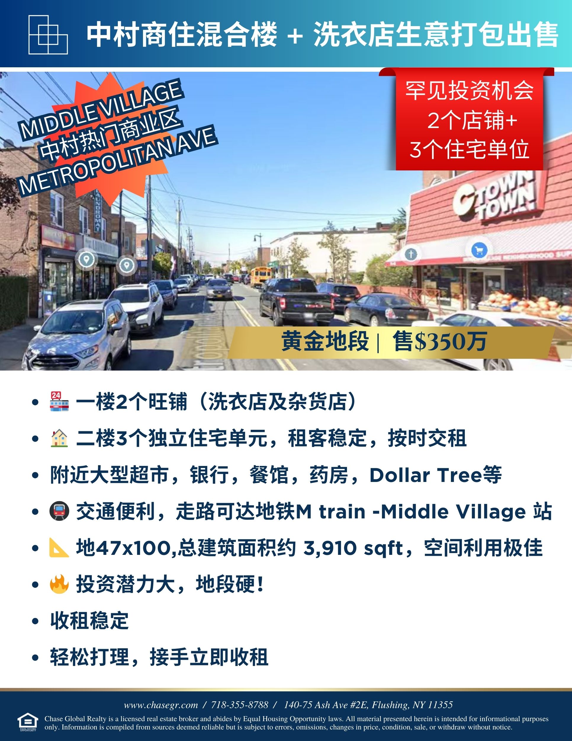 📍 Middle Village 中村繁华核心地段,新上市 Mixed-Use 独栋商住混合楼 + 洗衣店生意打包出售