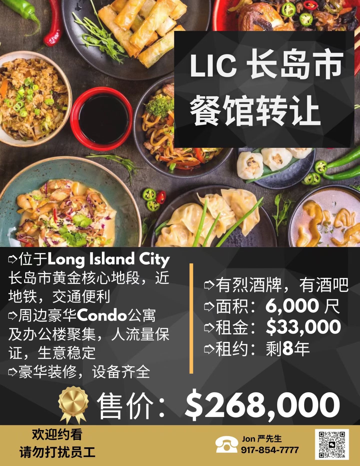 位于长岛市繁华核心区域,靠近主要交通枢纽,周边写字楼与高端公寓聚集,保证固定客流和持续生意来源。社区成熟,周边商业氛围浓厚,物业稀缺度高,长期经营潜力大。