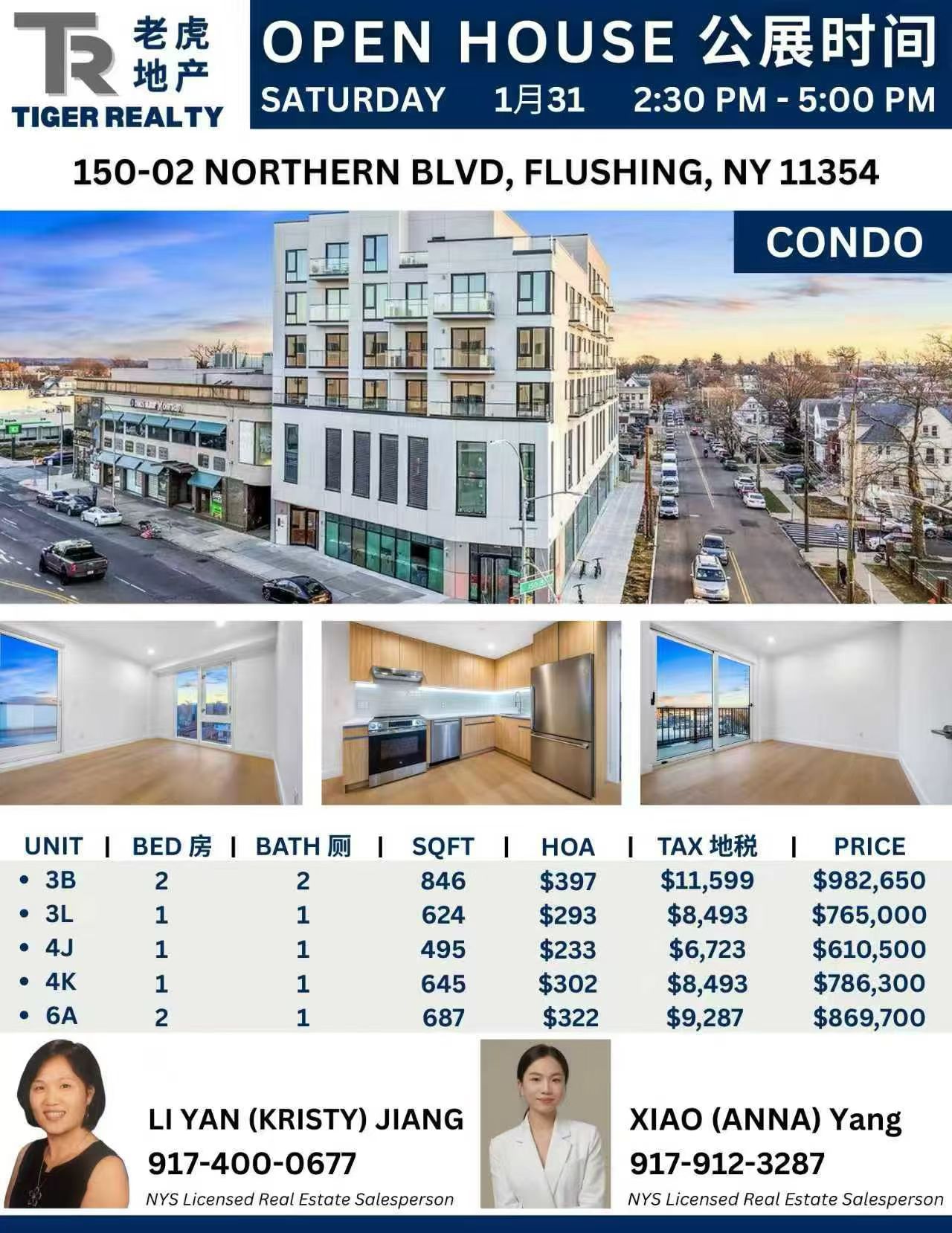 老虎地产全新推出 法拉盛Northern Blvd高端Condo,商住两用,地段优越,交通便利。楼盘总共43户住宅,户型涵盖1房1卫及2房2卫,每户配有阳台和室内洗衣机/烘干机,兼顾舒适生活与投资回报。