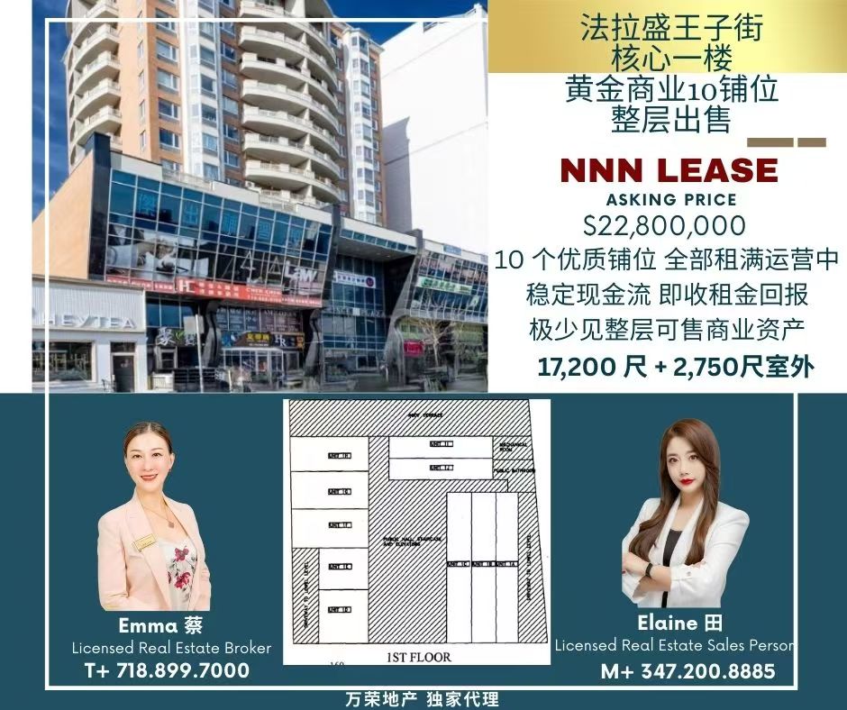 位于法拉盛王子街核心位置,交通便利、人流量密集,是纽约华人商业黄金街段。整层共10个优质铺位,全部租满NNN合同,现金流稳定,买入即可即收租金回报。地段稀缺、满租运营,是投资自住或长期保值的理想资产。