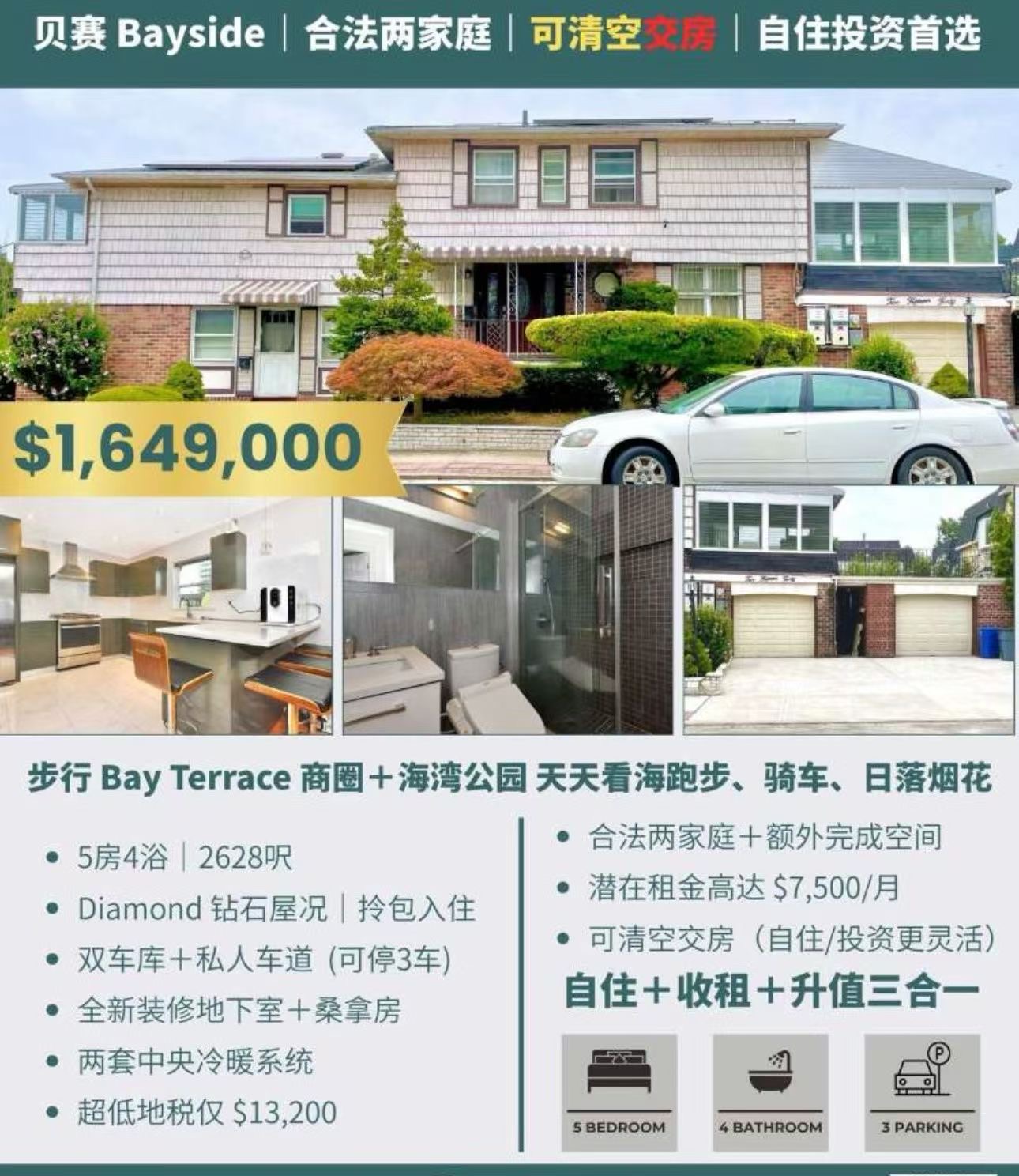 Bayside这套合法两家庭豪宅,空间宽敞、装修精美、地段优越、低地税,兼顾自住和投资,售价$1,649,000,机会难得,慧眼买家速联系!
