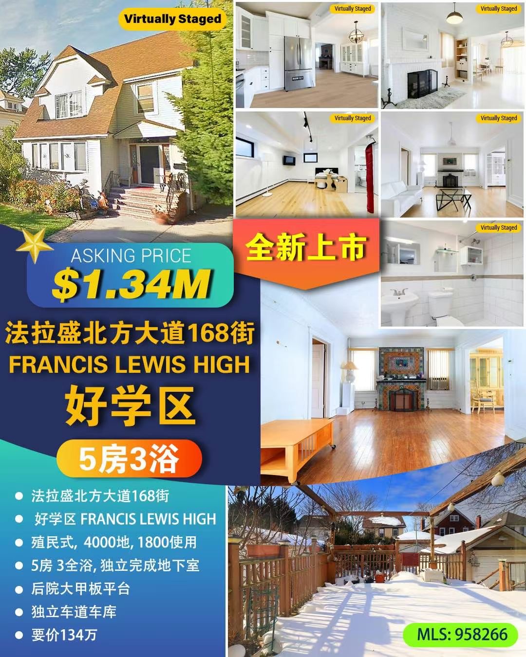法拉盛北方大道168街独栋殖民式住宅,全新上市,5房3浴、独立地下室、大后院甲板平台、独立车道与车库,坐落Francis Lewis顶级学区,升值潜力大,黄金地段、舒适宜居、拎包入住,错过即失,先到先得!