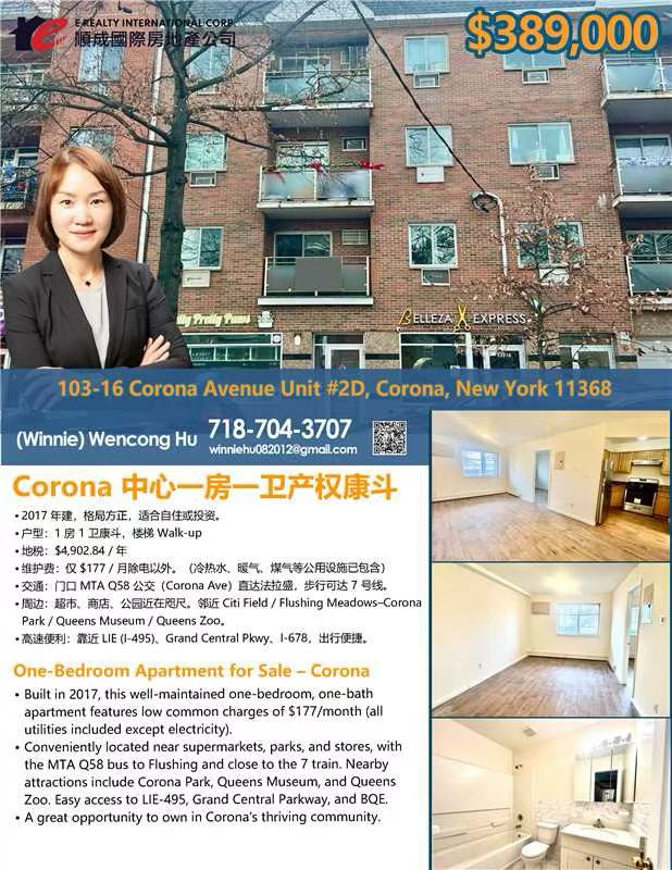 位于 Corona 可乐娜中心区域,这套一房一卫康斗格局方正,建于2017年,产权明晰(Walk-up),交通便利,生活机能完善,是自住或投资的理想选择。
