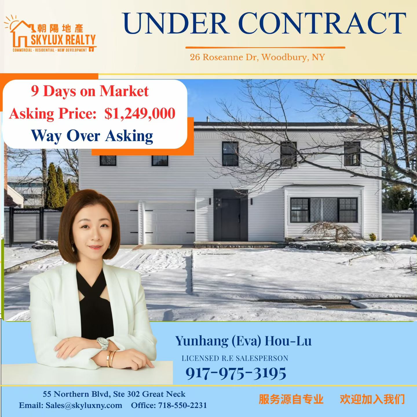 热烈祝贺 朝阳地产 Eva Hou 团队再次创造佳绩!位于 Woodbury 核心学区的独栋住宅在上市短短 9天内便成功签约,成交价格远超要价,充分体现了 精准市场策略、专业谈判技巧和优质房源价值的完美结合。