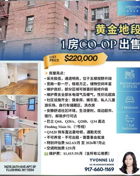 法拉盛核心位置142-15 26th Ave, Apt 5F 全新上市明亮一卧室Coop公寓,位于五楼,视野开阔,采光充足,空间布局方正。社区安静舒适,生活便利,周边超市、银行、邮局近在咫尺,通勤轻松方便。维护费包含水、电、煤气及暖气,性价比极高。配套设施完善,健身房、娱乐室、儿童游乐场、自行车储藏区及洗衣房一应俱全。