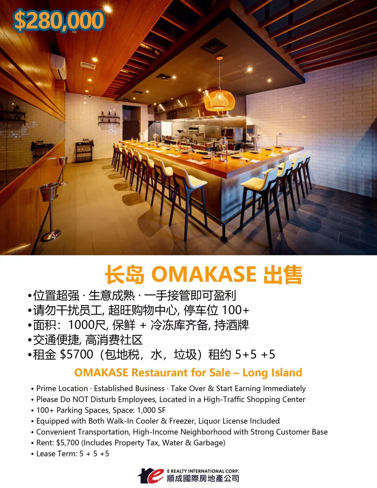 长岛核心繁华购物中心独家Omakase餐厅出售,地理位置优越,社区消费力强,人流稳定,生意成熟,一手接管即可盈利。餐厅面积约1000平方尺,配备全套冷藏冷冻设施,持酒牌,停车便利,适合高端餐饮投资或接手运营。租约稳健,租金合理,长线收益稳定,适合投资人和餐饮创业者。