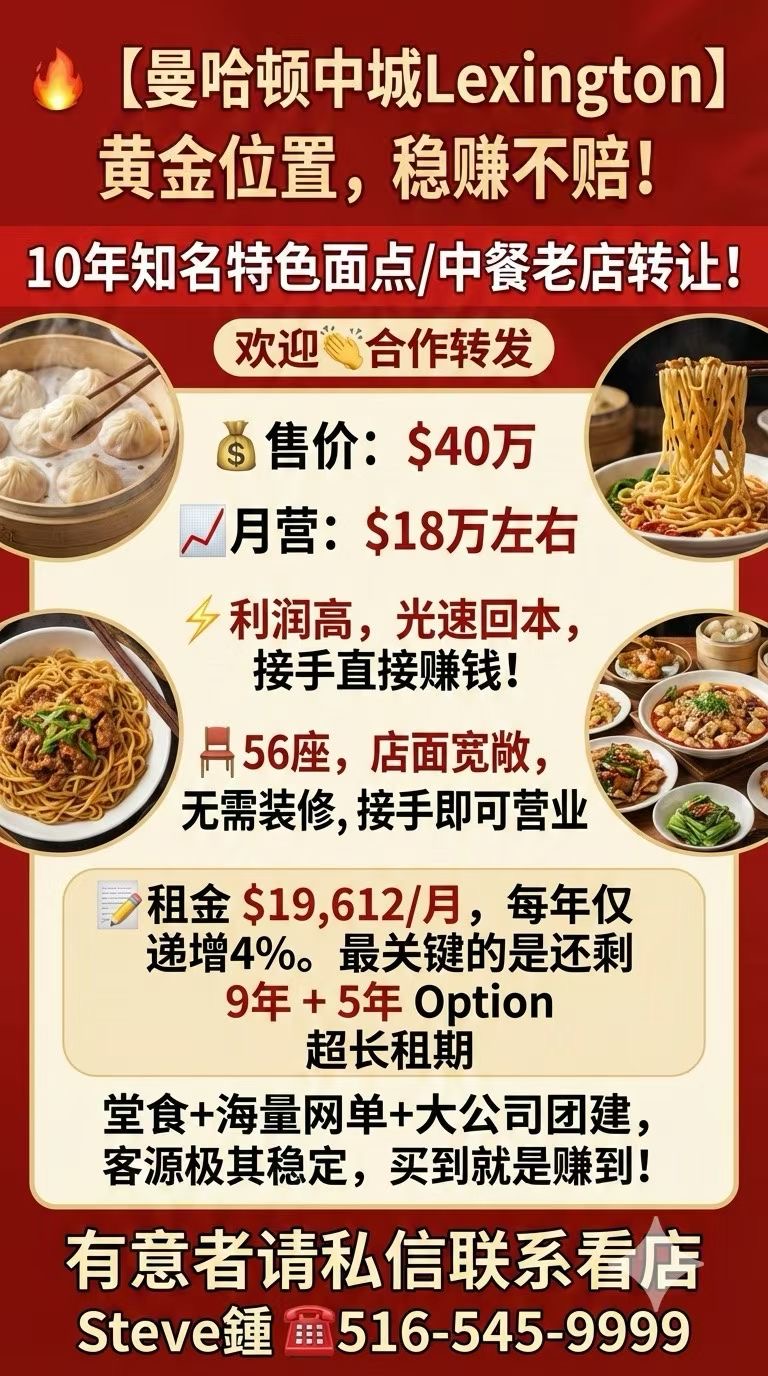 曼哈顿中城 Lexington 核心商圈,这家 经营 10 年的知名特色面点/中餐老店 拥有稳定客源、超高曝光率和长期租约优势,是投资者或餐饮创业者的绝佳机会。