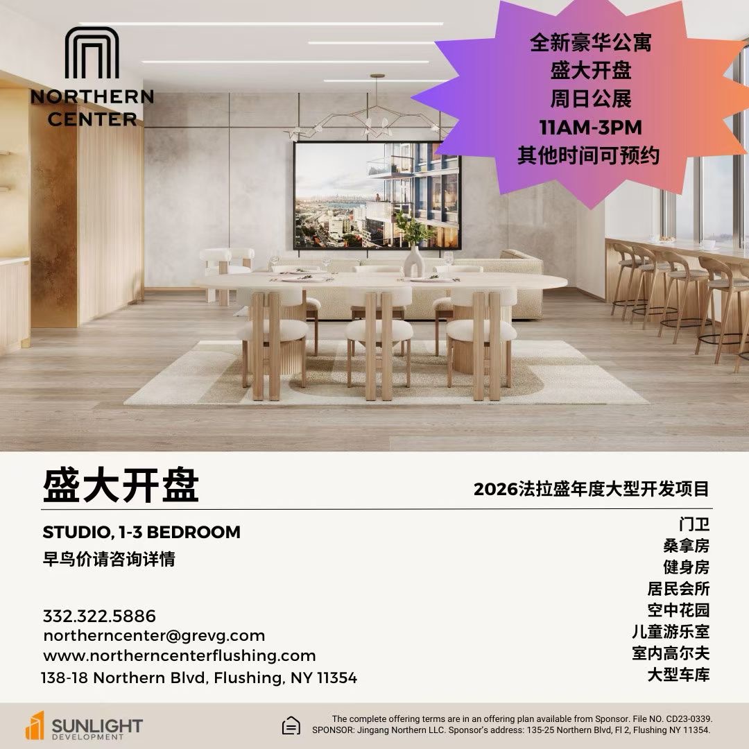 Northern Center 的高端住宅与商业组合,完美融合生活、工作与休闲,是法拉盛少有的高品质综合项目。周日公展机会有限,欢迎亲临体验未来生活与投资的理想选择。