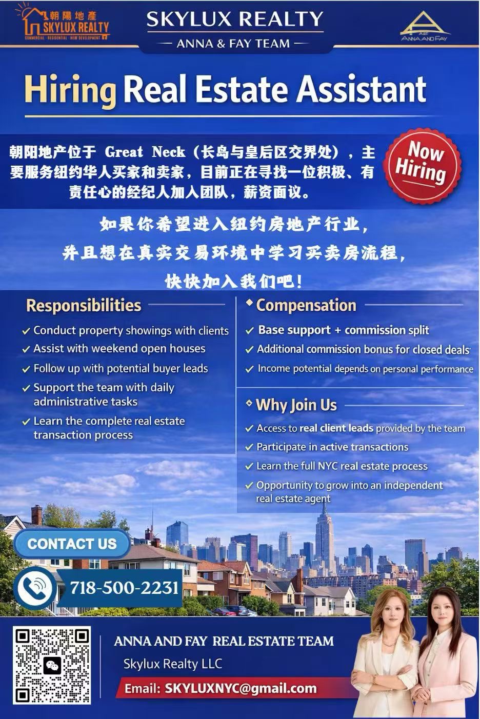朝阳地产诚聘地产助理--Skylux Realty – Anna & Fay Team