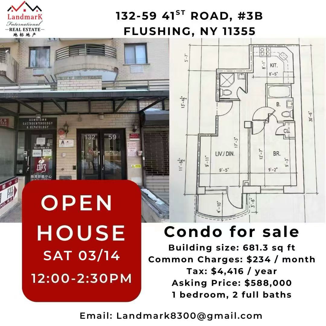 法拉盛核心地段康斗出售|132-59 41st Ave|681平方英尺|Junior 4格局|两卫|坐北朝南|阳台|管理费$234/月|地税$4,416/年