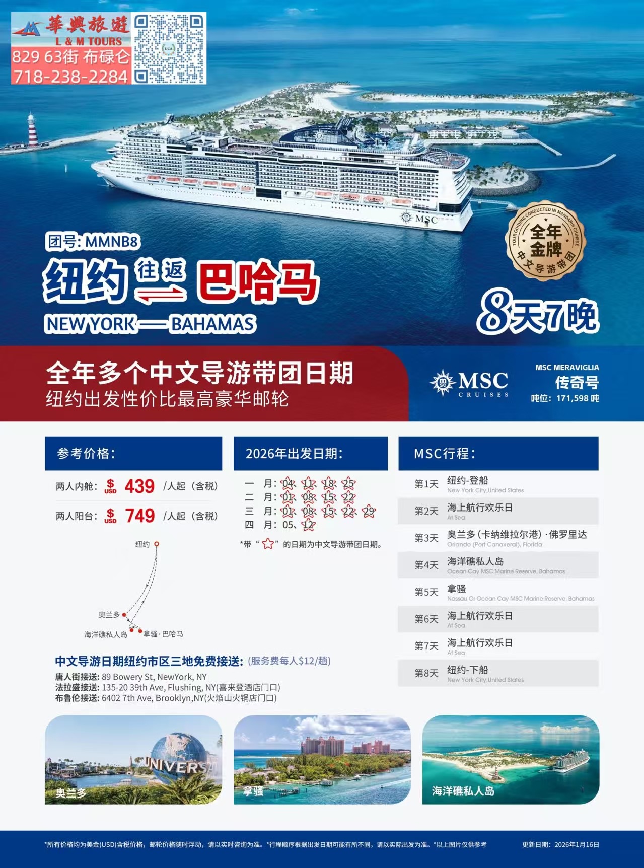 纽约出发畅游巴哈马豪华邮轮|中文导游全程陪同|8天7晚 MSC Meraviglia传奇号