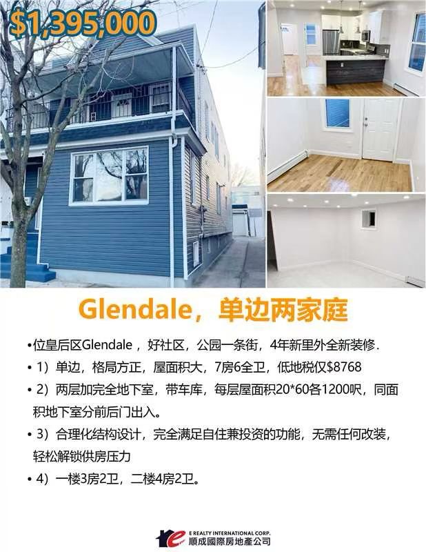 这栋Glendale单边两家庭住宅,集自住舒适与投资高回报于一身,是皇后区市场上少有的高性价比房源。无论是希望长期持有获得稳定租金收入,还是希望自住并兼顾收租,这套房屋都能满足需求。抓住机会,本周日开放看房,欢迎合作转发与预约!