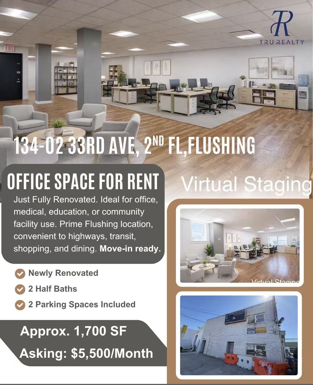 法拉盛核心地段稀缺办公室资源,全新装修、干净明亮的办公空间现正招租!地址位于 134-02 33rd Ave 2楼,总面积约 1700平方尺,布局合理、光线充足,为您的企业或机构提供专业、舒适、便捷的办公环境。无论是办公、医疗诊所、培训机构还是社区服务中心,这里都是理想选择。
