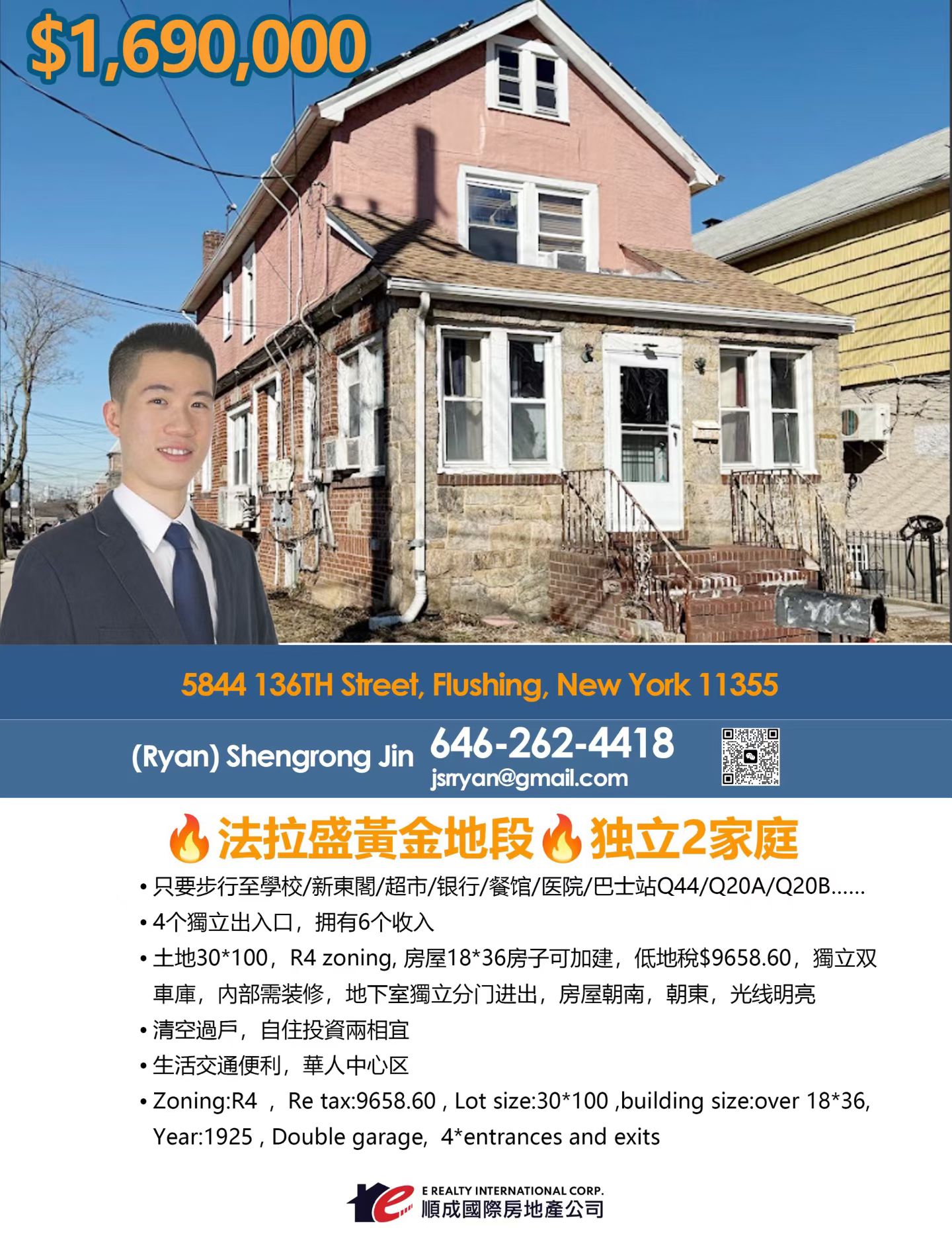 法拉盛鯉魚門核心黄金地段独家代理,全新上市在即,已签约即将公示!该两家庭独立住宅位于生活便利、交通便捷的区域,步行即可到达缅街商圈、学校、新东阁超市、银行、餐馆及医院,公交线路包括Q44/Q20A/Q20B/Q88,让您的出行高效便捷。房屋占地约30×100尺,R4分区可加建,提供灵活的自住或投资空间选择,是买家难得的高潜力住宅机会。