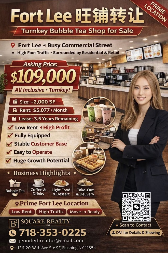 在当前市场环境下,低租金+成熟商圈+现成设备的组合越来越稀缺。这家Fort Lee奶茶店不仅节省前期大量时间与成本,更提供一个可以快速产生收益的平台。如果你正在寻找一个“接手即做”的餐饮项目,这个机会值得认真考虑。