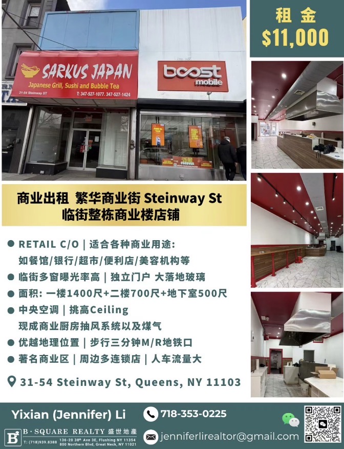 皇后区Astoria核心商业街Steinway St整栋临街商铺出租|RETAIL C/O可做餐馆银行超市美容等多业态|1400+700+500尺三层空间|带商业厨房抽风与煤气系统|大落地玻璃高曝光|步行3分钟地铁M/R线|人流密集成熟商圈|纽约优质商铺稀缺机会月租$11,000