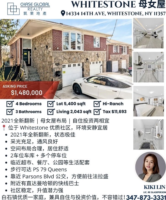 凯业地产独家代理,Whitestone 白石镇精美一家庭独栋,2021 全屋翻新,状态极佳,母女屋布局多代同堂理想选择。位于安静高端社区,采光通透、通风良好,空间利用率高,居住舒适。交通便利,靠近 Parsons Blvd 公交及直达曼哈顿快线巴士,生活配套完善,兼具自住与投资潜力。