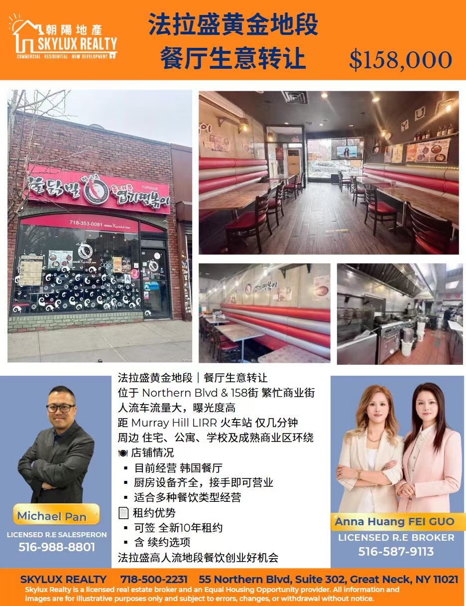 独家代理|朝阳地产 ANNA & FAY TEAM 精选推荐法拉盛 Northern Blvd & 157街顶级餐饮铺面,地处皇后区最繁华商业街区,人流量大、车流稳定,是餐饮创业及投资的绝佳选择。铺面现经营韩国餐厅,厨房设备齐全,接手即可营业,无需额外投入装修成本,多种餐饮模式皆可入驻,商机稀缺,投资自用两相宜。