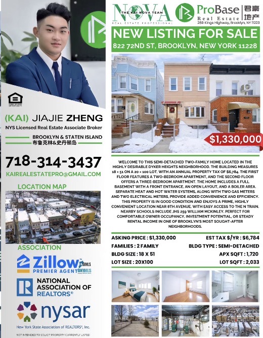 布鲁克林Dyker Heights黄金地段,这套半独立两家庭住宅兼具 舒适居住与投资潜力。整栋建筑占地 20×100尺,建筑面积 18×51尺,年地税仅 $6,784。房屋状况良好,布局合理,拥有完整地下室、独立前入口及宽敞开放空间,非常适合家庭自住或长期出租。