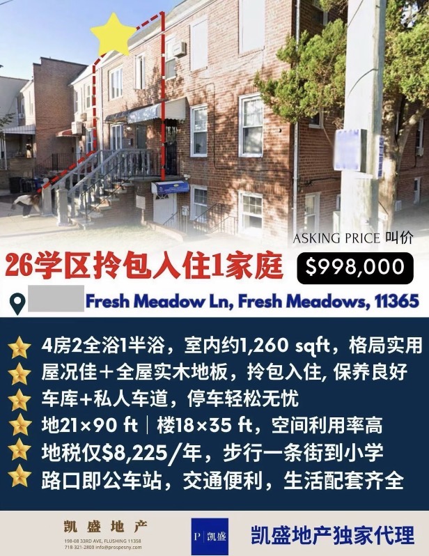 这栋 Fresh Meadows 26学区联排独栋 集学区优势、便利交通与优质屋况于一体,是自住或投资的绝佳选择。机会稀缺,先到先得,欢迎实地参观体验。