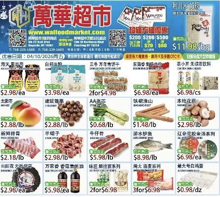 纽约华人超市 万华超市①号店(Bayside贝赛店) 将于 2026年4月10日 推出限时特价活动,多款生活必需品与热门食品同步优惠,数量有限,先到先得,是近期贝赛区最值得关注的超市折扣活动之一。