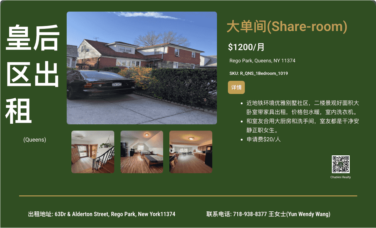 皇后区Rego-Park_优雅别墅社区大单间出租