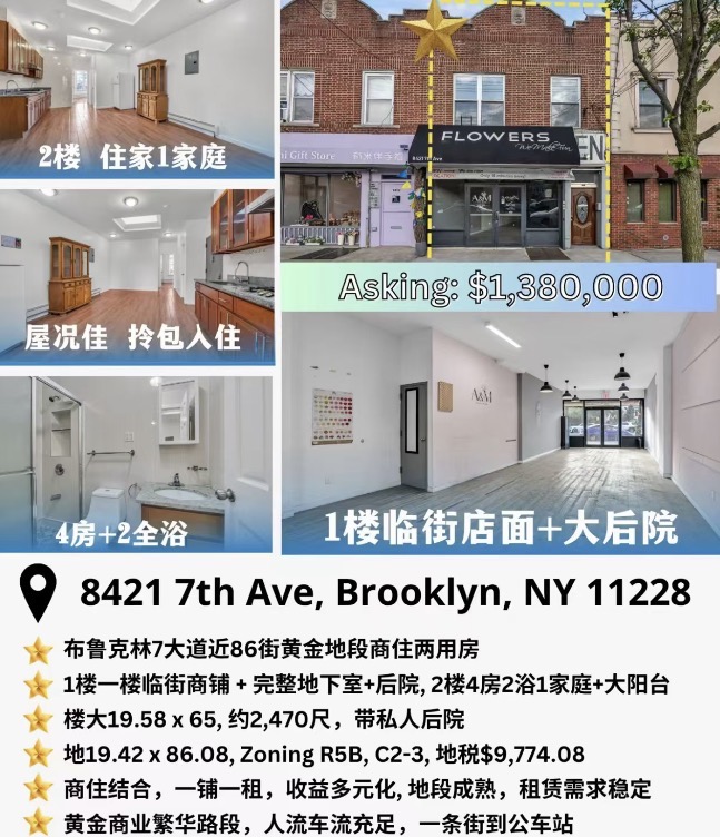 纽约核心投资市场中,位于Brooklyn, New York 7大道(7th Ave)靠近86街的商业地段,一直被视为“高人流+高曝光+稳定租赁需求”的成熟投资区域。本次推出的商住一体物业,属于典型的“底层商业+上层住宅”结构,在当前市场中具备明显稀缺性与现金流优势。